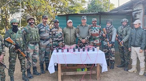 In the second incident on Monday, a joint combing operation conducted by the 19 Garhwal Rifles, 58 Central Reserve Police Force (CRPF), A-115 Border Security Force (BSF), and Churachandpur district police recovered arms, explosives, and ammunition, including three unexploded improvised rockets, at Thangjing Hill near Teijang village, Churachandpur.