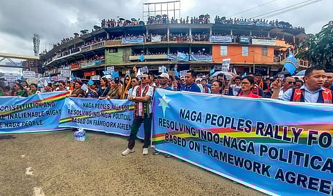 IMPHAL: A massive rally was organised by the Naga tribals in Manipur on Wednesday, demanding resolution of the decades-old Naga political issue based on the Framework Agreement, signed between the Central government and the NSCN-IM on August 3, 2015. Organised by the United Naga Council (UNC), the apex body of the Nagas in Manipur, the huge rally was held in Manipur’s four Naga-dominated districts—Tamenglong, Chandel, Ukhrul, and Senapati—which are along the Nagaland and Myanmar borders. After the rallies in the four districts, the UNC submitted a memorandum addressed to Prime Minister Narendra Modi through the Deputy Commissioners. Holding placards and banners, the participants of the rally, comprising men and women, gave slogans for an early solution to the Naga peace talks. The apex Kuki tribal body, Kuki Inpi Manipur (KIM), and Hmar Inpui, the apex body of Hmar tribes, had supported the UNC’s mass rally.