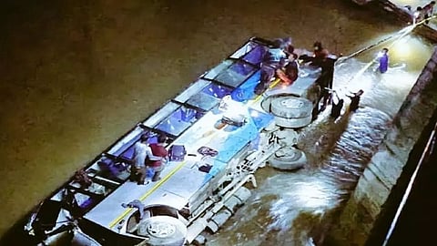 The Fire & Emergency Services personnel were rushed to the accident site for helping the victims. Local people told the police that the bus hit the bridge posts before plunging into the swollen River.