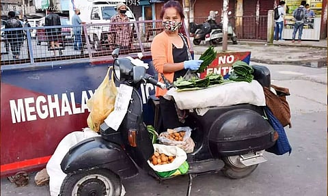 Iewduh market in Shillong, one of the buzziest locales in the city, is the original area where womenfolk used to sell the trademark Meghalayan betel nuts and leaves; however, the market is being kept closed owing to the rampant spread of the coronavirus disease. Now, Kharbuli uses the old scooter as a stand or shop on which she lays out her wares for purchase.