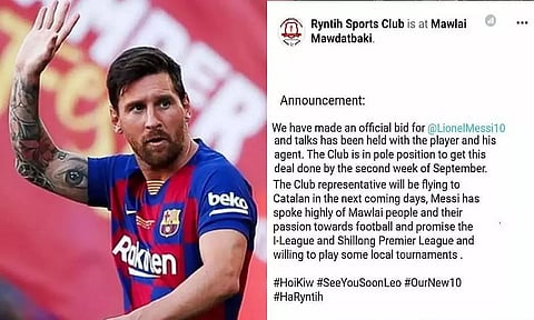 The baffling statement apparently made by the club, which is one of the bigger clubs in Meghalaya reads: "We have made an official bid for Lionel Messi and talks have been held with the player and his agent. The Club is in pole position to get this deal done by the second week of September. The Club representative will be flying to Calatan in the next coming days, Messi has spoken highly of Mawlai people and their passion towards football and promise the I-League and Shillong Premier League and willing to play some local tournaments."