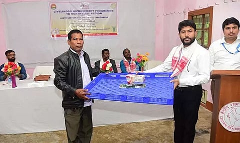 MENDIPATHAR: Incubation Centre of North East Hill University (NEHU), Tura campus distributed essential items to the Muga and Eri farmers in collaboration with Mega Eri Silkworm Seed Organization (MESSO) of Central Silk Board on Sunday at Mendipathar in North Garo Hills District, Meghalaya.