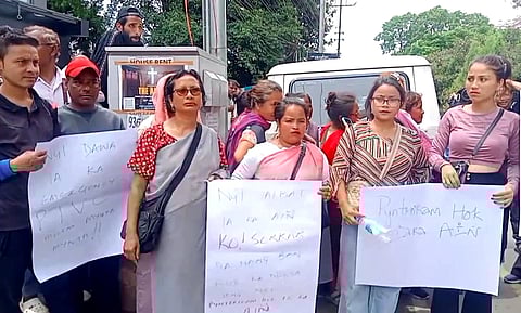 Shillong: Tension flared outside the Meghalaya Secretariat as members of the Meghalaya and Greater Shillong Progressive Hawkers and Street Vendors Association (MGSPHSVA), backed by Thma U Rangli Juki, staged a protest against the alleged illegal eviction drive carried out at Khyndailad. The hawkers claimed the eviction was unlawful and arbitrary, targeting even those with valid vending certificates.