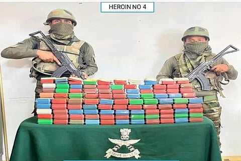 AIZAWL: Assam Rifles, along with representatives of the Custom Preventive Force Department, Champhai, recovered 2.5 kg of heroin No. 4 worth Rs 17.54 crore from the general area of Kelkang, Champhai district. The recovered contraband has been handed over to the Custom Preventive Force Department, Champhai, for further action. (ANI)