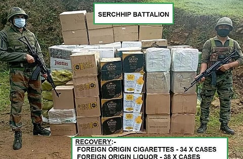 MIZORAM: The Serchhip Battalion of Mizoram Range Assam Rifles (East), under the aegis of Inspector General Assam Rifles (East), recovered 34 cases of Foreign Origin Cigarettes, 38 cases of Foreign Origin liquor, and 178 cases of Foreign Origin Beer worth Rs 52.58 Lakh in the general Area of Zokhawthar-Melbuk Road on Monday.