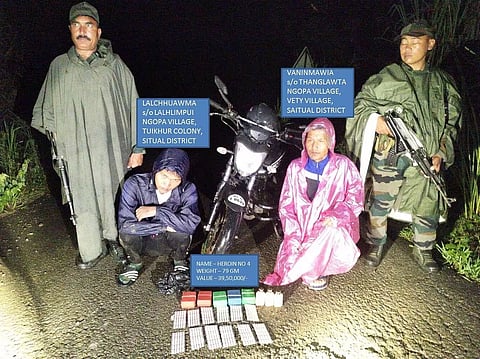 MIZORAM: The Aizawl Battalion of 23 Sector Assam Rifles under the aegis of Inspector General Assam Rifles (East), along with Ngopa Police Station, recovered five soap boxes (79 gm) of Heroin No. 04 from the personal bags of the individuals carrying it along worth Rs 39,50,000 in General Area Tuisa Iron Bridge and apprehended two individuals on Wednesday.