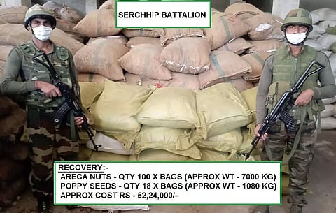 MIZORAM: The Serchhip Battalion of Mizoram Range, under the aegis of Inspector General Assam Rifles (East), recovered 30 bags of poppy seeds worth Rs 5.4 Lakh in the general area of New Champhai, Champhai, 100 bags of illegal areca nuts, and 18 bags of poppy seeds in the general area of Melbuk, Champhai, worth Rs 52.24 Lakh on Friday in two separate operations. The operations were carried out by a combined team of COB Champhai, COB Zokhawthar of Mizoram Range Assam Rifles, Custom Department Champhai, and Land Custom Station Zokhawthar based on specific information. The entire consignment has been handed over to Custom Department Champhai and Land Custom Station Zokhawthar for further legal proceedings., stated a press release.