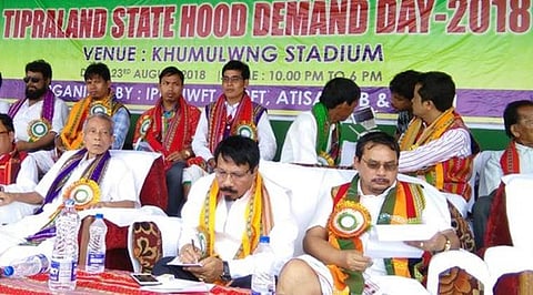 The Khumulwng Academy Grounds in the Tripura Tribal Area Autonomous District Council (TTAADC) headquarters saw a sea of protesters as all were voicing the slogan ‘Bharat Sarkar Hamare Mange Pura Karo’, ‘No Tipraland, No Rest’ on Thursday. The day is being observed as the 10th Tipraland Demand Day by the state’s ruling ally Indigenous Peoples Front of Tripura (IPFT). The protest showed a huge gathering of at least ten thousand supporters.