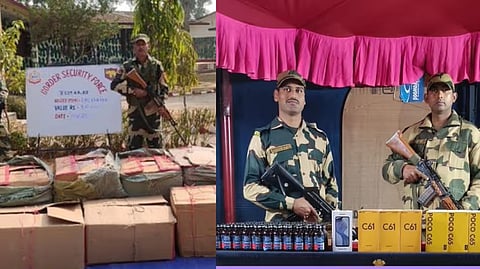In another operation on 31st December 2024, BSF personnel present at the border outpost of Dipak seized 80 new mobile handsets and 239 bottles of cough syrup containing brands, such as Phensedyl and Eskuf. The total value of the confiscated materials was estimated to be Rs. 9.34 lakh.