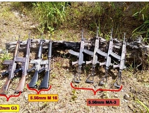 On being confronted approximately 500 meters from the border on the Indian side, the two suspects on a Kenbo motorcycle tried to flee into Myanmar. In the ensuing chase, the suspects abandoned their motorcycle and gunny bag and crossed River Tyao which marks the international boundary and fled into Myanmar. The search of the gunny bag led to the recovery of two US origin 5.56mm M-16 rifles, two German origins 7.62mm G-3 rifles and four Myanmar origin 5.56mm MA3 assault rifle.
