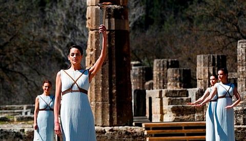 Greek actress Xanthi Georgiou in the role of an ancient Greek High Priestess used a concave mirror to focus the sun’s rays and lit the torch at 12.10 a.m. local time on Thursday.