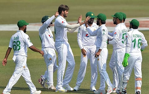 Sajid Khan and Nauman Ali's stay at the crease was cut short by Hossain and Taijul respectively. Still, 73 runs behind Bangladesh's first innings score at that point, Pakistan's last-wicket pair of Shaheen Shah Afridi and Faheem Ashraf added a crucial 29 runs to reduce the lead to 44. Taijul scalped the final wicket, with Ashraf departing after a vital knock of 38.