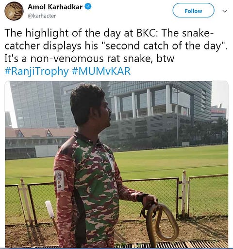 He tweeted: “The highlight of the day at BKC: The snake-catcher displays his “second catch of the day”. It’s a non-venomous rat snake, btw #RanjiTrophy #MUMvKAR.”