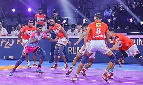 BENGALURU: The Jaipur Pink Panthers put up a calm and collective performance to defeat Gujarat Giants 25-18 in a Pro Kabaddi League season 9 match at the Shree Kanteerava Indoor Stadium, here on Saturday. This is the Panthers' third successive victory in the ongoing season. Raiders Rahul Chaudhari and Arjun Deshwal picked up nine points between them, while they were backed spectacularly by their defense unit.