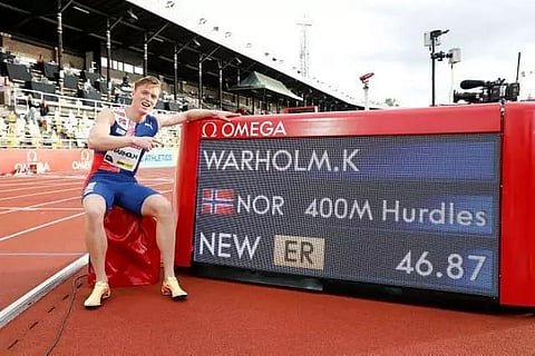 Norwegian sprinter Karsten Warholm broke his own European record in the 400 metres hurdles at Sunday's Diamond League event in Stockholm, clocking a time of 46.87 seconds that was just 0.09 seconds off the world record that has stood for 28 years.