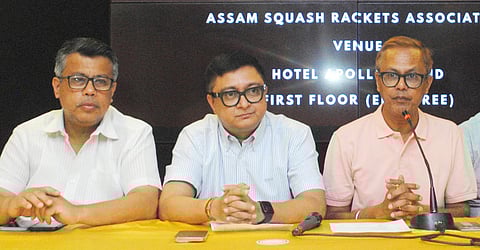 The media briefing was attended by several key officials from the Assam Squash Rackets Association, including Secretary Rakesh Tiwari, Treasurer Rajib Gupta, and sports organizer Kalyan Gogoi.