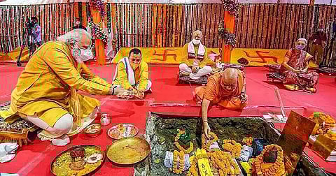 On Wednesday, Prime Minister Narendra Modi laid down the first brick of Ram temple in Ayodhya. The 'Bhumi Pujan' ceremony was performed by Prime Minister Modi at the auspicious time or 'muhurat' in the holy city in the presence of saints, Uttar Pradesh Chief Minister Yogi Adityanath and RSS chief Mohan Bhagwat.