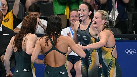 The Australian team of Mollie O'Callaghan, Lani Pallister, Brianna Throssell and Ariarne Titmus finished in an Olympic record time of seven minutes 38.08 seconds at the La Defense Arena. The US finished 2.78 seconds behind with Ledecky putting in a fighting third leg to haul teammates Claire Weinstein, Paige Madden and Erin Gemmell up from third to second.