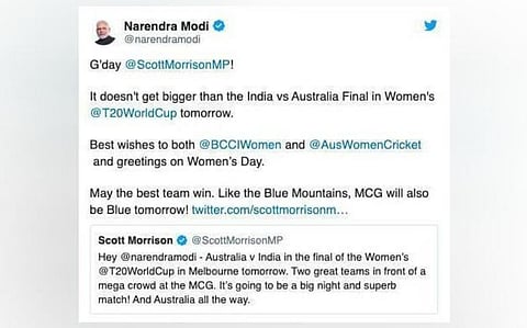 Modi retweeted him with the quote: "G' day @ScottMorrisonMP! It doesn't get bigger than India vs Australia final in Women's @T20WorldCup tomorrow. Best wishes to both @BCCIWomen and @AusWomenCricket and greetings on Women's Day. May the best team win. Like the Blue Mountains, MCG will also be Blue tomorrow! (sic)" IANS