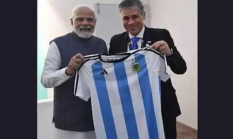 BENGALURU: Indian Prime Minister Narendra Modi was gifted a jersey of the Argentinian football team, featuring World Cup-winning champion Lionel Messi's name by the president of YPF from Argentina Pablo Gonzalez on the sidelines of the India Energy Week in Bengaluru. Last year in December, Argentina came out victorious in the intensely fought final in what was the last World Cup for Argentine talisman Lionel Messi.
