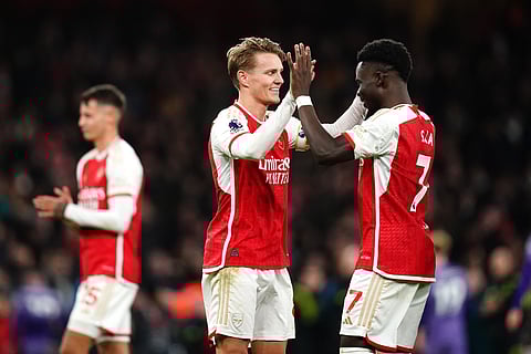 London [UK]: Arsenal blew open the Premier League title race as they defeated 10-player Liverpool 3-1 at Emirates Stadium, moving closer to the table-toppers opposition on Sunday. Bukayo Saka delivered the opening blow to Liverpool in the 14th minute. But at the stroke of the first-half end, Gabriel Magalhaes scored an unfortunate own goal, gifting Liverpool an equaliser. This own goal did not dampen the spirits of the Gunners as Gabriel Martinelli (67th minute) and Leandro Trossard (in the stoppage time, 90+2 minute) scored the match-sealing goals. Arsenal is now number two, with 15 wins, four draws and losses, giving them 49 points, just two short of table-toppers Liverpool, who have 15 wins, six draws and two losses, giving them 51 points.