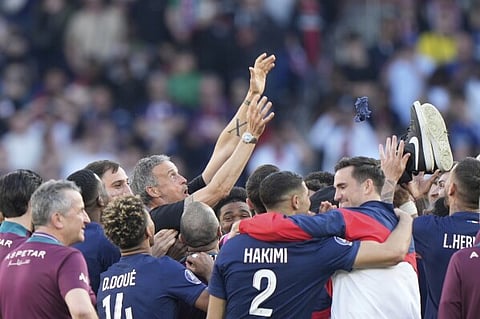 PARIS: Paris St Germain (PSG) remained unbeaten as it won its fourth straight Ligue 1 title on Saturday after a 1-0 win over Angers gave Luis Enrique’s side an unassailable lead in the French top-flight. The victory, courtesy of a Desire Doue goal, moved PSG to 74 points with six rounds left. PSG is 24 points ahead of second-placed AS Monaco, who play later on Saturday but can reach only 71 points if they win all their remaining games. Although the first half was goalless, PSG utterly dominated possession and took 11 shots, with Goncalo Ramos taking nearly half of those, but the home side could not find the net.