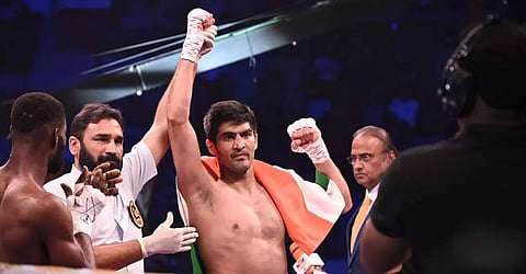 The Bhiwani boxer then landed a series of straight jabs, hooks and upper cuts which took the wind out of Sulley as he clinched the rope. Another hook from behind spelt the end of the contest.