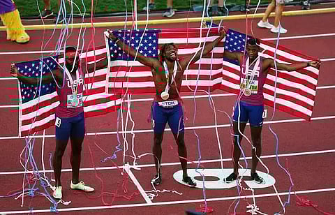 Thursday's race was the second 1-2-3 for U.S. men in Eugene after Fred Kerley, Marvin Bracy and Trayvon Bromell swept the 100m. It is the first time any country has swept the two men's sprints in the same year at the worlds.