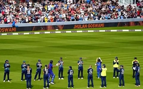 LONDON: Legendary fast bowler Jhulan Goswami on Saturday received a guard of honour from the players while walking out to bat for the final time in international cricket during India's third ODI against England at Lord's on Saturday.