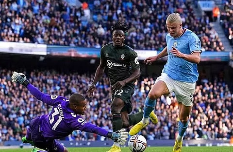 LONDON: Erling Haaland scored for the 10th game in a row in all club competitions as Manchester City cruised to a 4-0 win at home to Southampton on Saturday to move to the top of the Premier League.