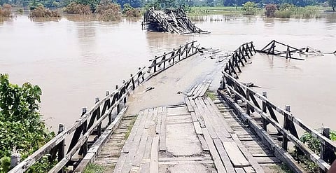The flood water washed away a wooden bridge over a suti (stream) of the Brahmaputra at Bhakat Chapori in Majuli this morning, disrupting communication to around 17 villages on the river island.