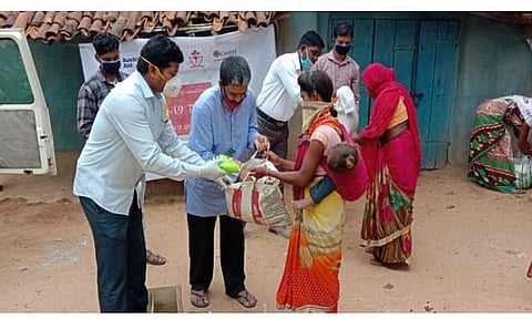 Each ration kit includes 5 kg of wheat flour, 2 kg of dal, 3 kg of rice, 500 ml of oil, 100 grams of turmeric powder, 100 grams of red chilli powder, 100 grams of cumin seeds, 100 grams of mustard seeds, 100 grams of curry masala, and two soaps.